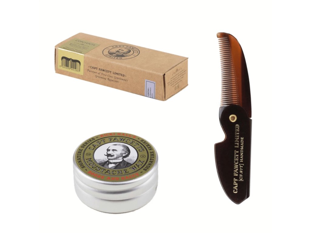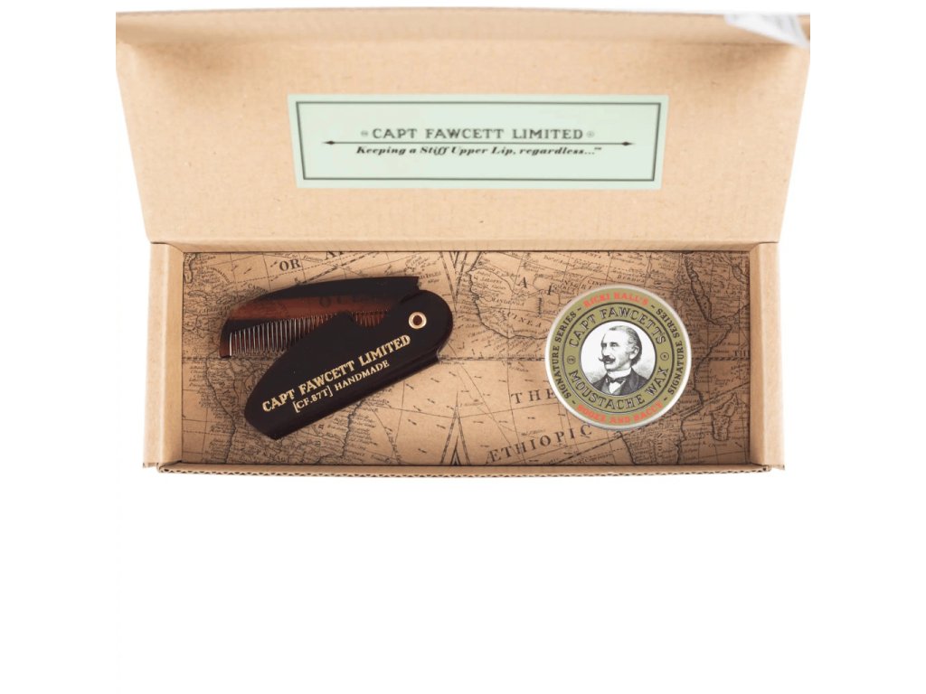 Darčekový set Cpt. Fawcett — Booze & Baccy Moustache Wax & Comb