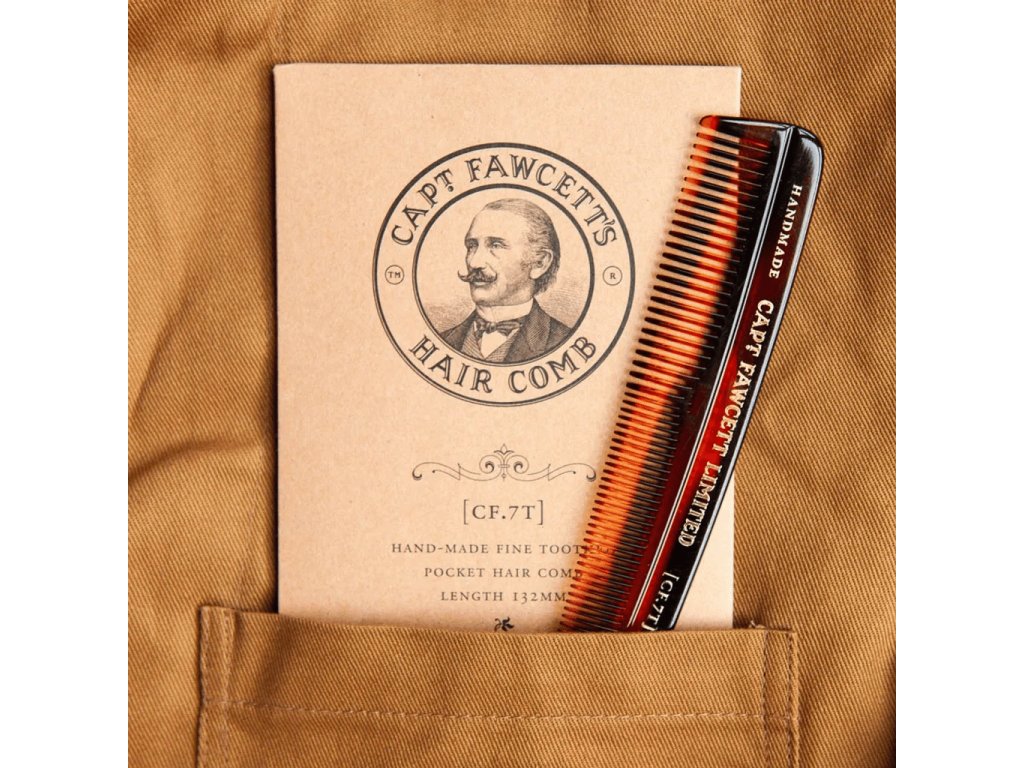 Značka Cpt. Fawcett, ikonická v oblasti pánskej starostlivosti, predstavuje ručne vyrábaný hrebeň, ktorý kombinuje funkčnosť, dizajn a tradíciu. Vďaka dvom šírkam zúbkov umožňuje dokonalé rozčesanie aj úpravu účesu a spolu s koženým puzdrom sa stáva neodmysliteľnou súčasťou výbavy každého štýlového muža.